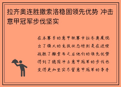 拉齐奥在本赛季凭借连胜撒索洛的表现,不仅稳固了在意甲中的领先优势,也为冲击意甲冠军打下了坚实的基础。通过出色的战术安排、关键球员的出色表现、科学的球队管理和有效的心理调节,拉齐奥展现了全方位的竞争力。这些因素共同作用,确保了他们能够在漫长的赛季中保持竞争力。
