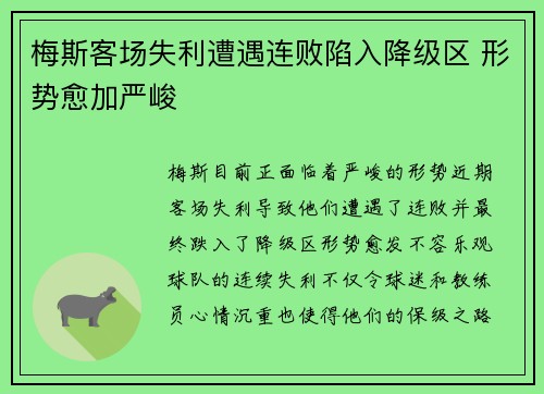 梅斯目前面临的困境是多方面的,连败的战绩、阵容的薄弱、战术执行的不足以及心理状态的影响,都加剧了球队的降级风险。通过分析这些问题,我们可以看出梅斯需要从多个方面进行反思和改进,包括调整战术、增加阵容深度、改进心理状态等。球队的命运虽然依然充满不确定性,但只要他们能够及时进行调整,依靠团队的努力,仍然有希望在剩余的赛季中避免降级。