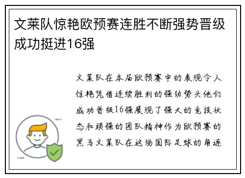 立即咨询文莱队在本届欧预赛中的表现令人惊艳,凭借连续胜利的强劲势头,他们成功晋级16强,展现了强大的竞技状态和顽强的团队精神。作为欧预赛的黑马,文莱队在这场国际足球的角逐中,以出色的战术执行力和高效的进攻防守配合,战胜了多支传统强队,赢得了世界足坛的广泛关注。本文将从四个方面详细阐述文莱队如何在欧预赛中保持连胜,并最终成功挺进16强,分别从球队的战术创新、关键球员表现、对手分析以及赛场外的管理支持等四个方面进行探讨。通过这些方面的分析,我们可以更加清晰地了解文莱队这一成功晋级之路背后的原因。