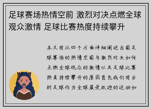 立即咨询本文将从四个方面详细阐述当前足球赛场的热情空前与激烈对决如何点燃全球观众的激情,以及足球比赛热度持续攀升的原因。首先,我们将分析足球作为全球最受欢迎的运动,如何通过赛事的规模、参与度以及文化影响力,成为了全球观众共同的狂欢盛宴。其次,文章将探讨现代足球比赛中技术革新和战术变化对比赛节奏、观赏性以及竞技水平的提升。接下来,我们将从观众互动与社交媒体的角度,分析如何通过实时互动与社交平台的传播,增强了全球观众的参与感与投入感,进一步推动了比赛热度的升温。最后,我们将从经济效益与足球商业化的视角,探讨现代足球的高投入、高回报及其对全球赛事热度的促进作用。通过这四个方面的探讨,本文将全面揭示足球比赛热度不断攀升背后的深层次原因。