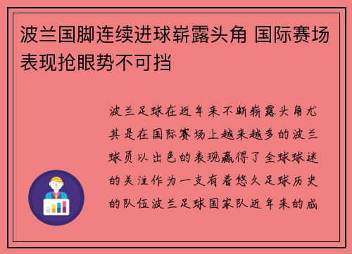 波兰国脚凭借连续进球和在国际赛场上的出色表现,已经成为波兰足球的耀眼新星。他不仅在俱乐部中展现了卓越的进攻能力,也在国家队中发挥了至关重要的作用。随着他个人能力的提升和与队友的默契配合,波兰足球的整体水平得到了显著提升。
