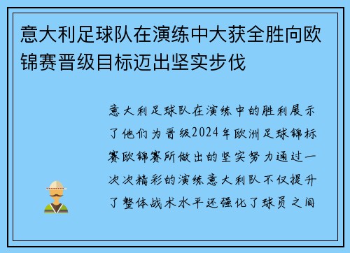 立即咨询意大利足球队在演练中的胜利,展示了他们为晋级2024年欧洲足球锦标赛(欧锦赛)所做出的坚实努力。通过一次次精彩的演练,意大利队不仅提升了整体战术水平,还强化了球员之间的默契与配合,这一系列的成就让球队朝着晋级目标迈出了坚实的步伐。本文将从四个方面深入探讨意大利足球队在演练中的表现,分析他们如何通过战术布局、球员磨合、心理建设以及对手分析,逐步积累了晋级欧锦赛的优势。这些方面的有效结合,不仅增强了球队的整体实力,也为即将到来的欧洲赛场奠定了坚实基础。